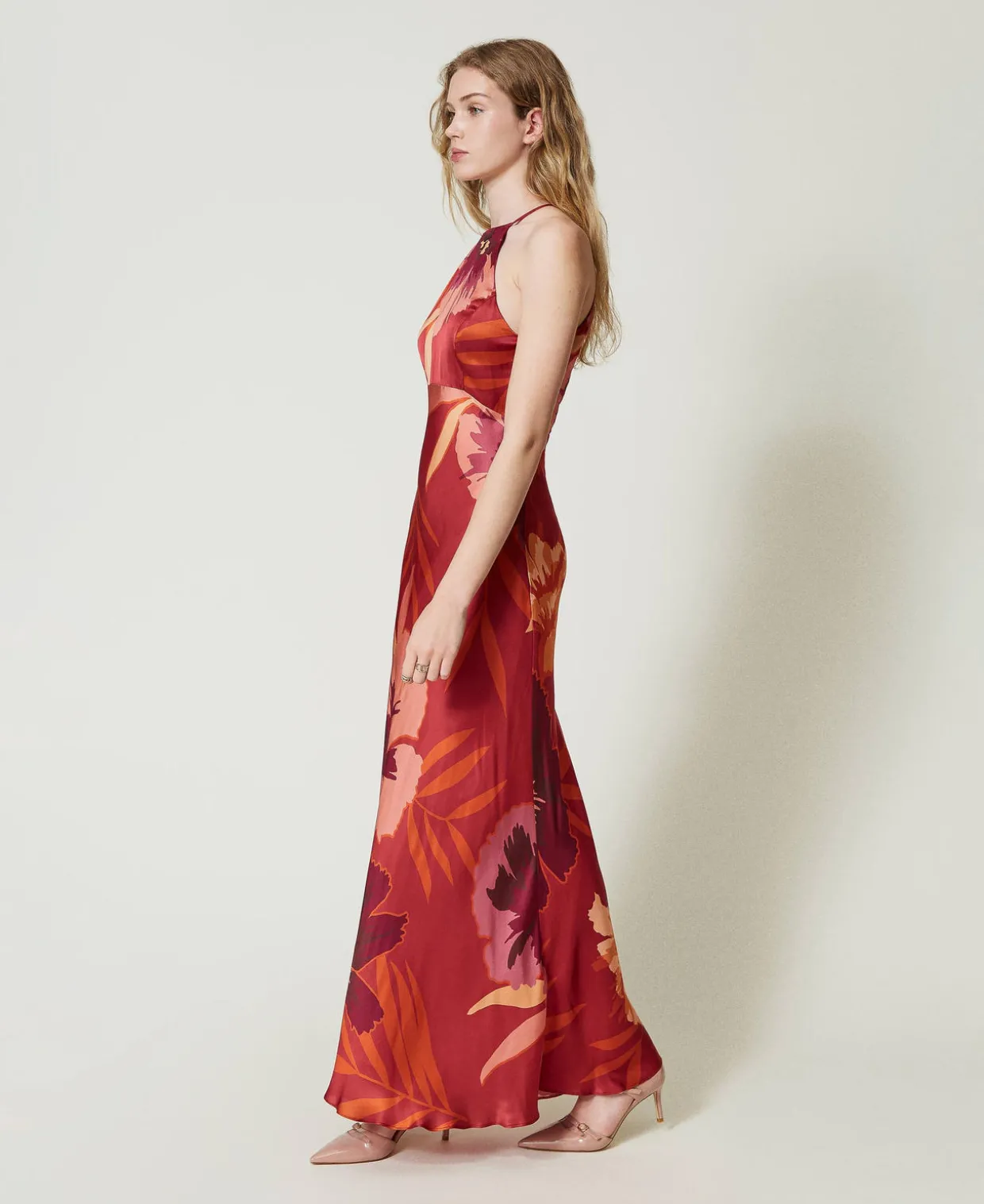 Maxikleid Aus Satin Mit Blumendessin Und Amerikanischer Schulter
